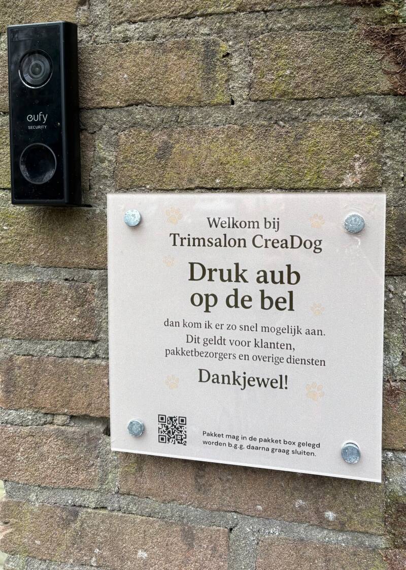 U kunt ook op de bel bij het muurtje aanbellen, dan weet ik dat u er bent e& zodra ik klaar ben met uw hond, zal ik het hekje voor u open doen